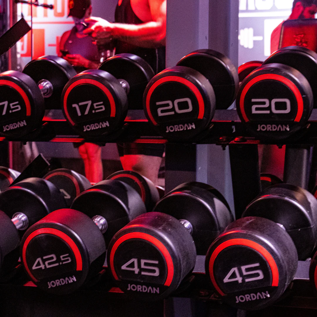 A wide variety of Jordan Fitness dumbbells are available to use at South Coast, including Premium Urethane Dumbbells, along with our classic rubber barbells, offering a full range of upper body workouts.